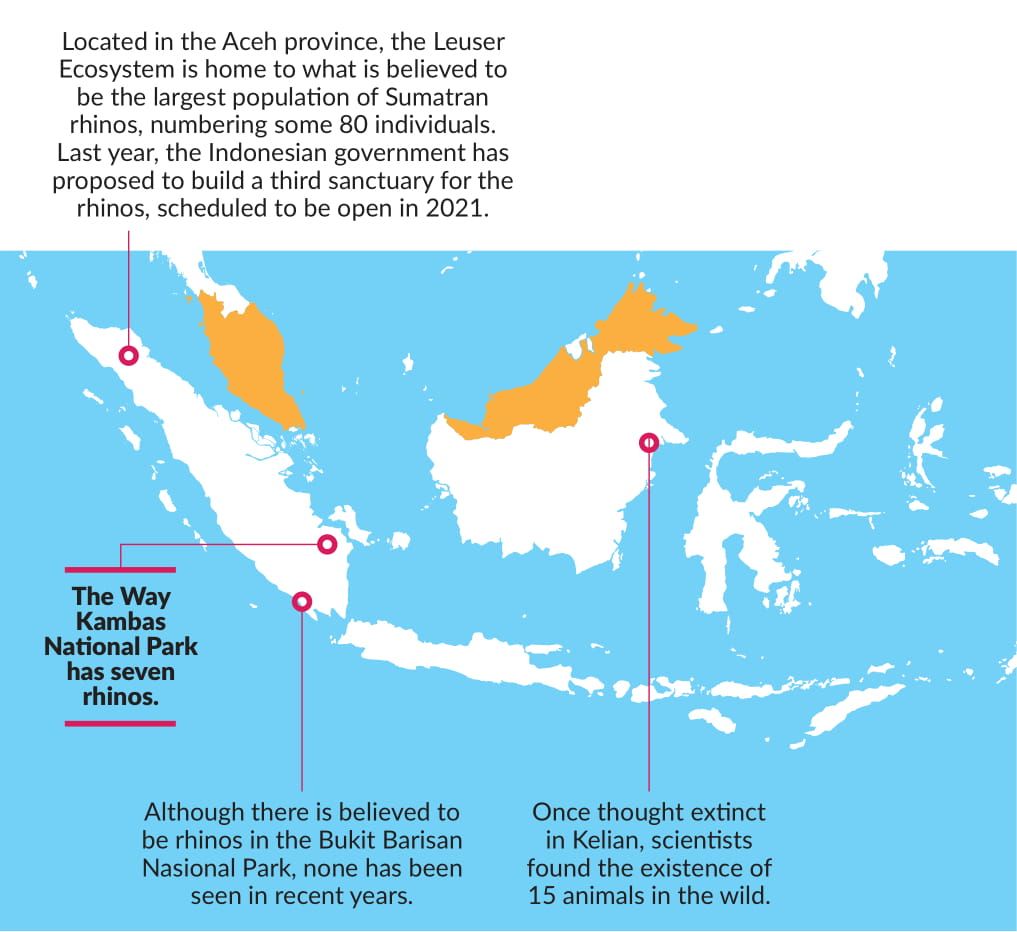 NUMBERING 58 to 68 individuals, the Javan rhino (Rhinoceros sondaicus) exists in only one place – the Ujung Kulon National Park in Java, Indonesia, situated across a narrow strait from Anak Krakatua, formed from the remains of an eruption of Krakatua in 1883.